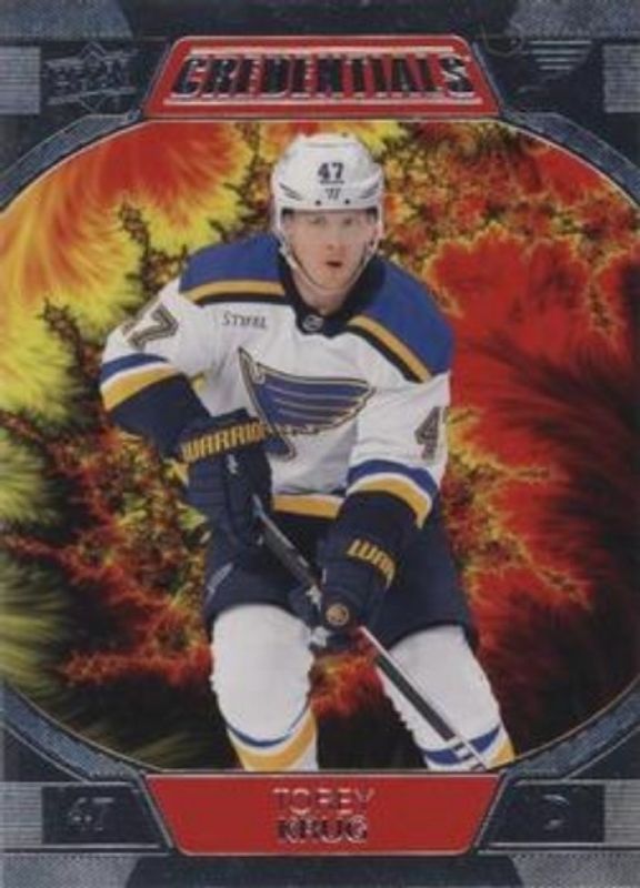 The Torey Krug 2022 Upper Deck Credentials #75 Mandelbrot Fractal card is 1 of 14 Torey Krug's card variations in the 2022 Upper Deck Credentials set being tracked by Sports Card Investor, including Base /999, Yellow, Red /299, Orange /149, and Blue /99.