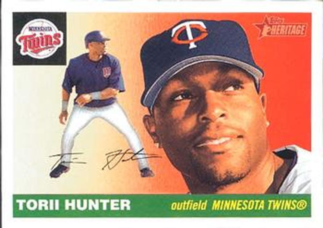 The Torii Hunter 2004 Topps Heritage #350 Base card is 1 of 5 Torii Hunter's card variations in the 2004 Topps Heritage set being tracked by Sports Card Investor, including Chrome /1955, Clubhouse Collection Relics, Chrome Refractor /555, and Chrome Black Refractor /55.