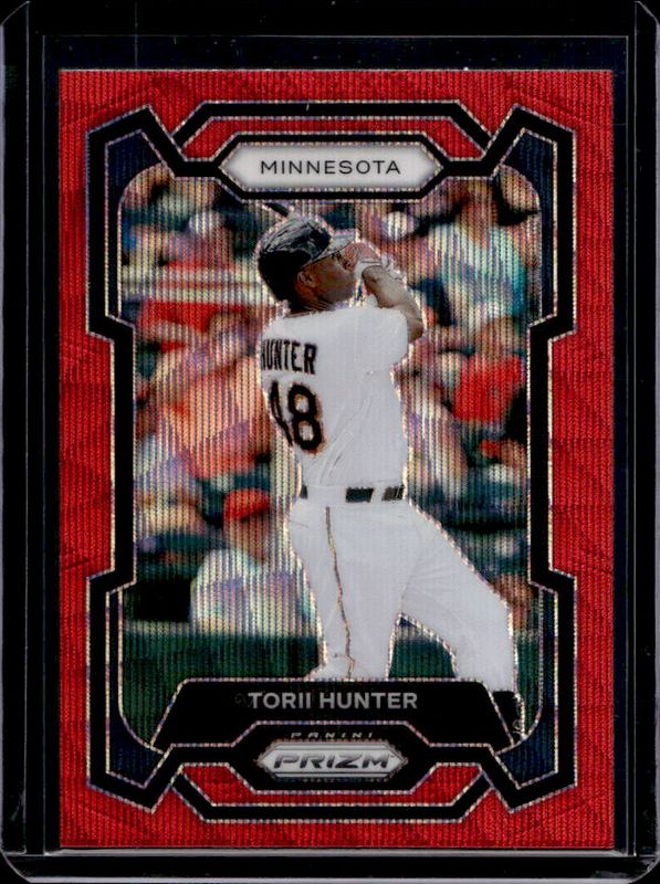 The Torii Hunter 2024 Prizm #28 Ruby Wave card is 1 of 30 Torii Hunter's card variations in the 2024 Prizm set being tracked by Sports Card Investor, including Base, Blue Ice, Green, Green Ice, and Pink Ice.