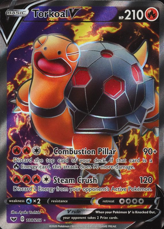 The Torkoal V 2020 Sword & Shield #188/202 Holo (Full Art) card in Raw TCG (Near Mint) condition has moved down -$5.30 (-66.3%) in the last 30 days and was last sold for $2.69 .