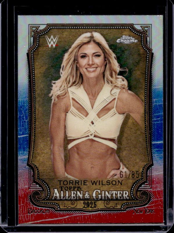 The Torrie Wilson 2025 Topps Chrome WWE #AG-TOR Allen & Ginter - Red White & Blue Refractor /85 card is 1 of 38 Torrie Wilson's card variations in the 2025 Topps Chrome WWE set being tracked by Sports Card Investor, including Allen & Ginter, Allen & Ginter - Refractor, Embedded, Hall of Fame Autographs, and Women's Division.