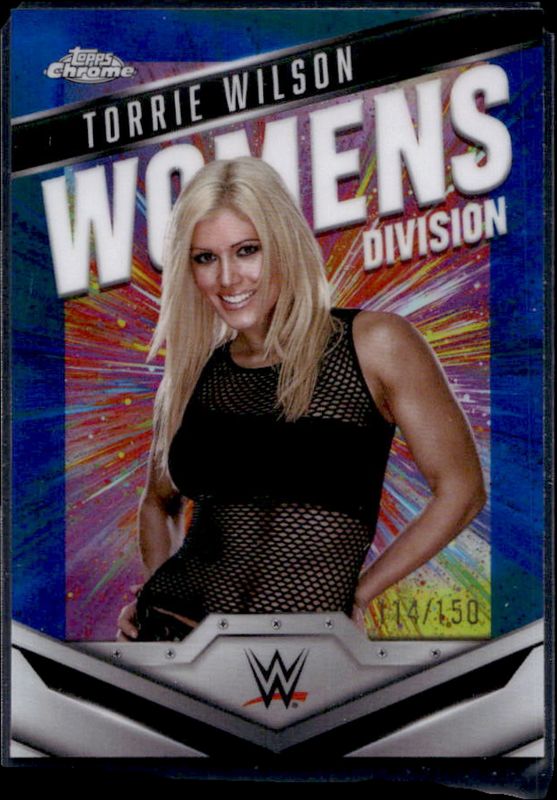 The Torrie Wilson 2025 Topps Chrome WWE #WD-TOR Women's Division - Blue Refractor /150 card is 1 of 38 Torrie Wilson's card variations in the 2025 Topps Chrome WWE set being tracked by Sports Card Investor, including Allen & Ginter, Allen & Ginter - Refractor, Embedded, Hall of Fame Autographs, and Women's Division.