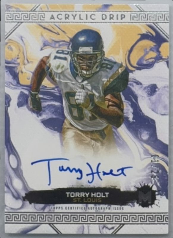 The Torry Holt 2023 Topps Motif #AD-TH Acrylic Drip Autographs /99 card is 1 of 33 Torry Holt's card variations in the 2023 Topps Motif set being tracked by Sports Card Investor, including Canvas Champions Autographs /99, Virtuoso Marks Autographs /99, Gallery Graphs Autographs /49, Acrylic Drip Autographs - Ultramarine Blue /20, and Canvas Champions Autographs - Blue /20.