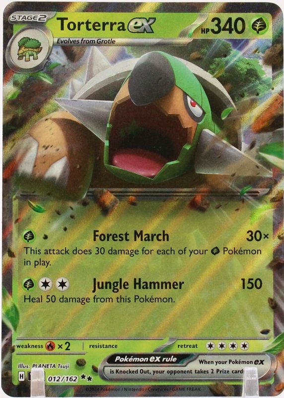 The Torterra ex 2024 Scarlet & Violet: Temporal Forces #012/162 Double Rare card in Raw TCG (Near Mint) condition has moved down -$0.32 (-17.9%) in the last 30 days and was last sold for $1.47 .