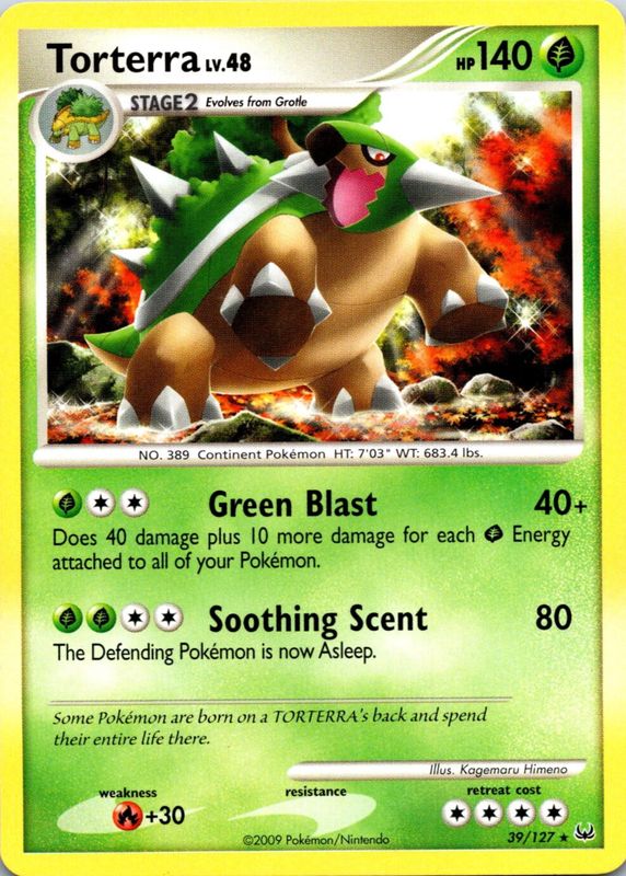 The Torterra 2009 Platinum #039/127 Base card in Raw TCG (Lightly Played) condition has moved down -$0.50 (-12.5%) in the last 30 days and was last sold for $3.49 .