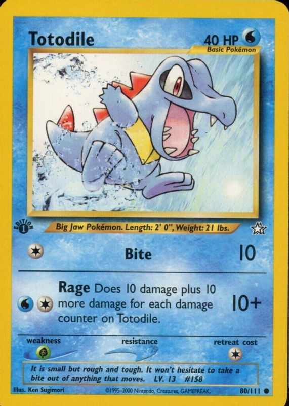 The Totodile 2000 Neo Genesis #80/111 1st Edition card in Raw TCG (Near Mint) condition has moved down -$1.87 (-16.5%) in the last 30 days and was last sold for $9.44 .