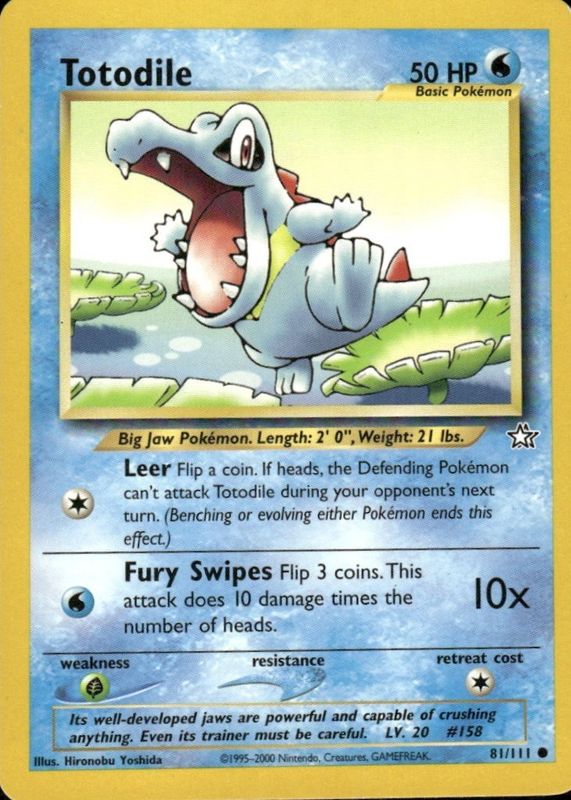 The Totodile 2000 Neo Genesis #81/111 Unlimited card in Raw TCG (Lightly Played) condition has moved up $0.90 (+90.9%) in the last 30 days and was last sold for $1.89 .