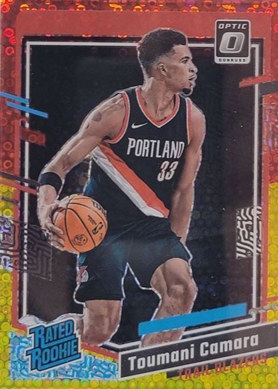 The Toumani Camara 2023 Optic #204 Fast Break Red & Yellow /7 Rookie card in Raw condition has not changed in price in the last 30 days and was last sold for $36.99 .