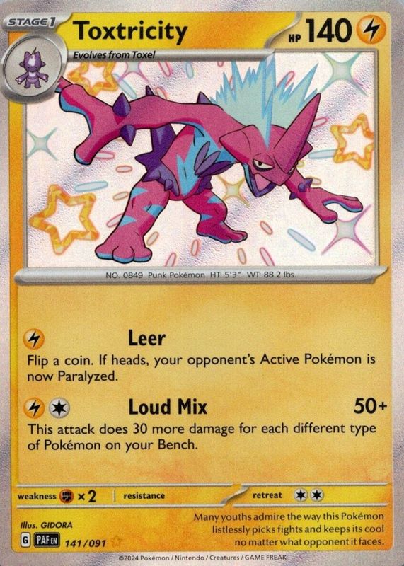 The Toxtricity 2024 Scarlet & Violet: Paldean Fates #141/091 Shiny Rare card in Raw TCG (Near Mint) condition has moved down -$0.05 (-1.3%) in the last 30 days and was last sold for $3.74 .