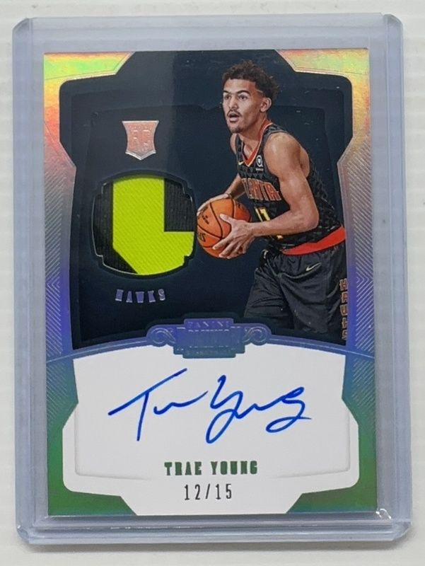 The Trae Young 2018 Dominion #180 Silver /15 Rookie card is 1 of 25 Trae Young's card variations in the 2018 Dominion set being tracked by Sports Card Investor, including #108 Rookies Metal /199, #180 Base /75, #108 Base /75, #180 Red /49, and #108 Red /49.