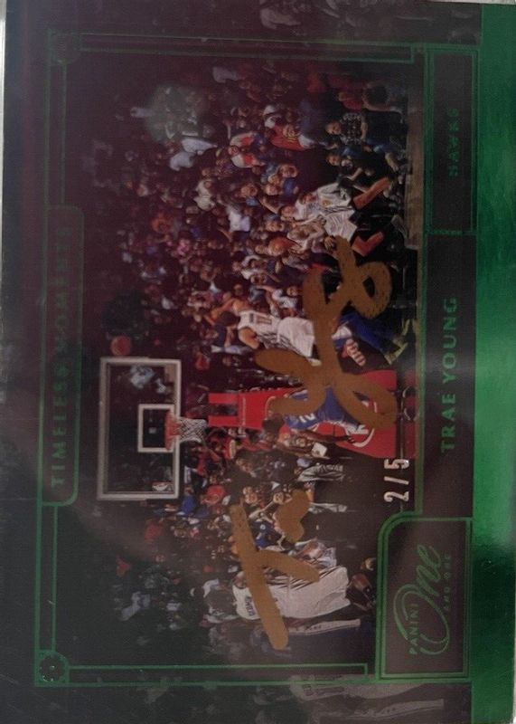 The Trae Young 2020 One and One #TML-TRY Timeless Moments Autographs - Green /5 card in Raw condition has not changed in price in the last 30 days and was last sold for $1,235.38 .