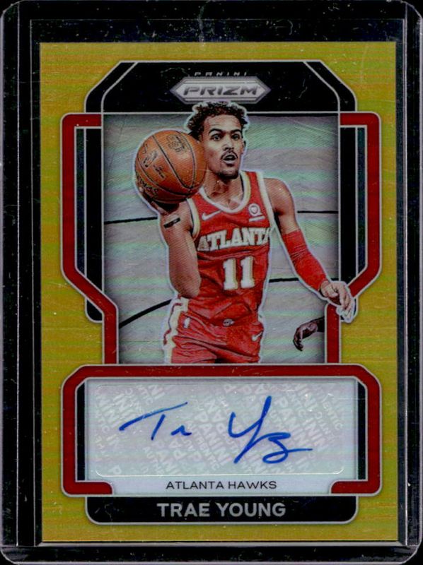 The Trae Young 2021 Prizm #SG-TYG Signatures - Gold /10 card is 1 of 119 Trae Young's card variations in the 2021 Prizm set being tracked by Sports Card Investor, including Base, Blue NBA 75th Anniversary, Blue Wave, Choice Blue Yellow Green, and Factory Set Blue Hyper.