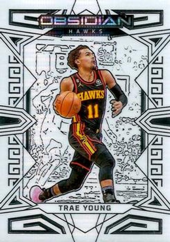 The Trae Young 2022 Obsidian #65 Electric Etch White Pulsar card is 1 of 41 Trae Young's card variations in the 2022 Obsidian set being tracked by Sports Card Investor, including Electric Etch Asia, Electric Etch Neon Flood, Electric Etch Purple /75, Electric Etch Red Yellow Green Flood /75, and Electric Etch Purple Flood /49.