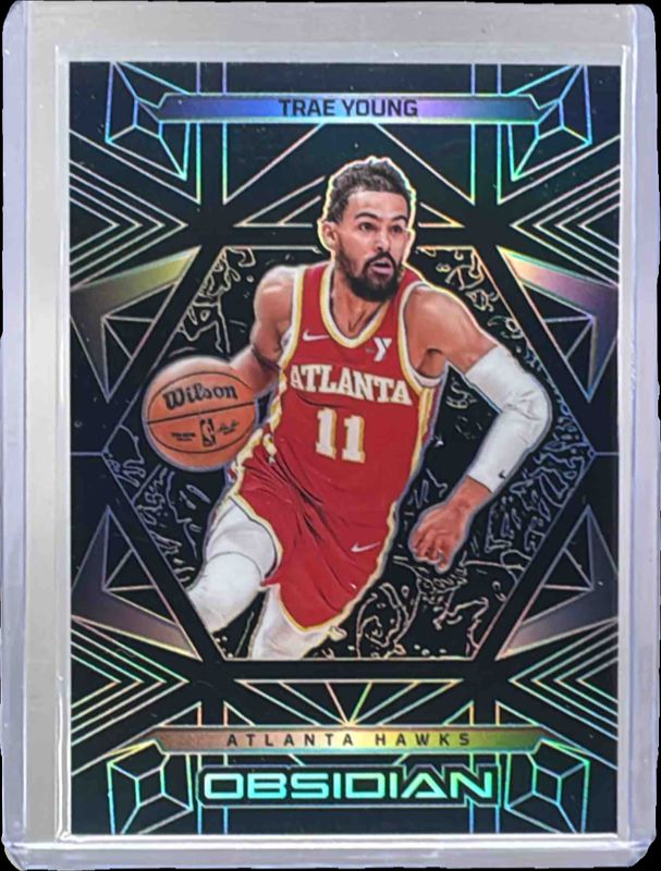 The Trae Young 2024 Obsidian #73 Base card is 1 of 74 Trae Young's card variations in the 2024 Obsidian set being tracked by Sports Card Investor, including #197 Base, #73 Electric Etch Caldera, #197 Electric Etch Caldera, #73 Electric Etch International, and #197 Electric Etch International.