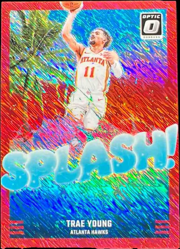 The Trae Young 2024 Optic #9 Splash! - Red Shimmer /75 card is 1 of 177 Trae Young's card variations in the 2024 Optic set being tracked by Sports Card Investor, including Base, Blue Velocity, Checkerboard, Choice, and Fast Break.