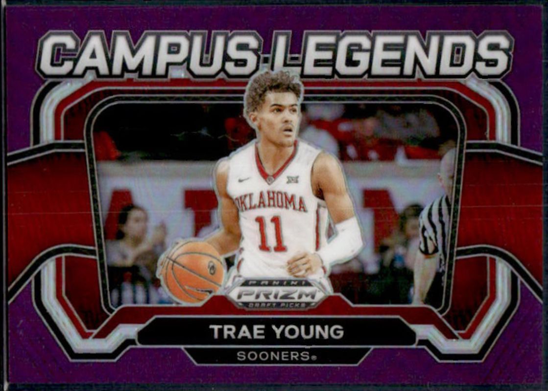 The Trae Young 2024 Prizm Draft Picks #7 Campus Legends - Purple /75 card is 1 of 179 Trae Young's card variations in the 2024 Prizm Draft Picks set being tracked by Sports Card Investor, including #49b Base, #49 Base, #49 Green, #49b Green, and #49 Green Wave.