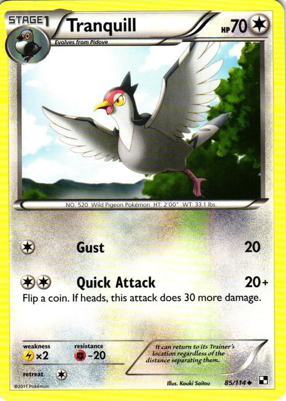 The Tranquill 2011 Black & White #085/114 Base card in Raw TCG (Lightly Played) condition has not changed in price in the last 30 days and was last sold for $1.99 .