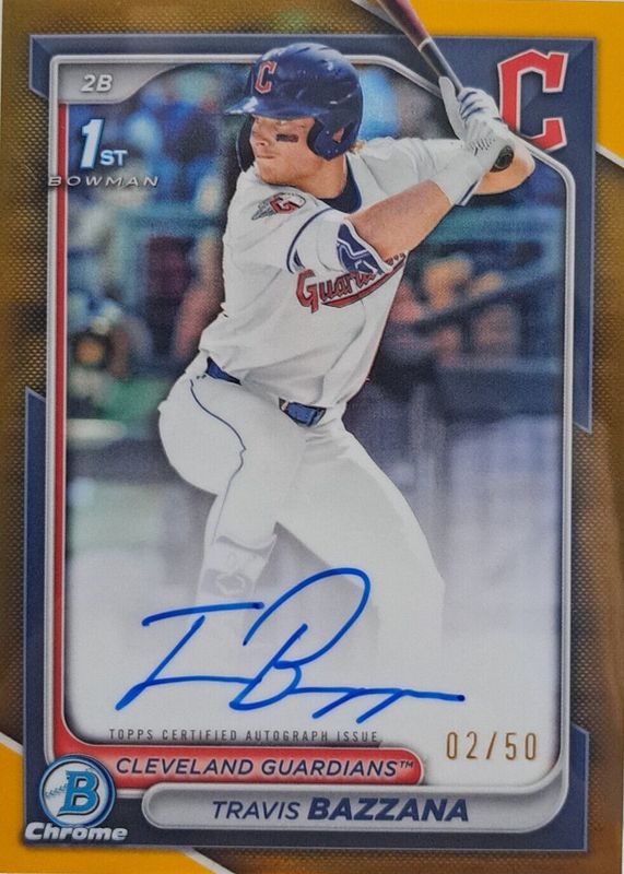 The Travis Bazzana 2024 Bowman Draft #CPA-TB Chrome DP Auto - Gold Refractor /50 (1st) card in Raw condition has not changed in price in the last 30 days and was last sold for $1,500.00 .