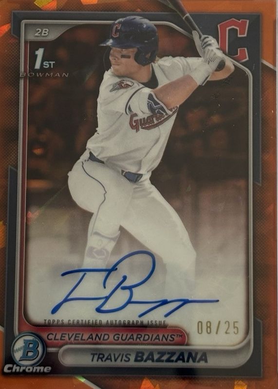 The Travis Bazzana 2024 Bowman Draft Sapphire Edition #CPA-TB Chrome Prospect Auto - Orange /25 (1st) card in Raw condition has not changed in price in the last 30 days and was last sold for $900.00 .