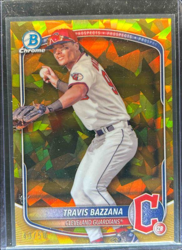 The Travis Bazzana 2025 Bowman Sapphire Edition #BCP-131 Chrome Prospects - Gold Refractor /50 card is 1 of 18 Travis Bazzana's card variations in the 2025 Bowman Sapphire Edition set being tracked by Sports Card Investor, including Chrome Prospects, Sapphire Selections, Sapphire Selections Autographs, Chrome Prospects - Green Refractor /99, and Chrome Prospects - Yellow Refractor /75.