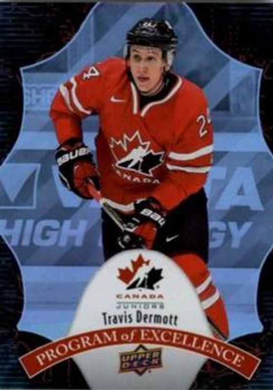 The Travis Dermott 2016 Upper Deck Team Canada Juniors #POE-7 Program of Excellence card is 1 of 26 Travis Dermott's card variations in the 2016 Upper Deck Team Canada Juniors set being tracked by Sports Card Investor, including #107 Base, #30 Base, #30 Exclusives /175, #30 High Gloss Spectrum /25, and #30 Gold /16.