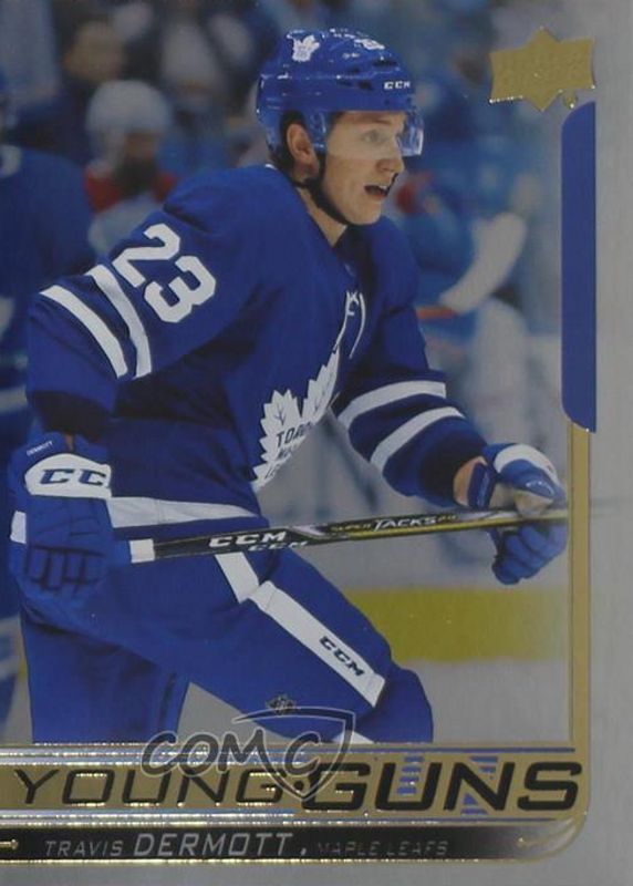 This card is 1 of 20 Travis Dermott's card variations in the 2018 Upper Deck set being tracked by Sports Card Investor, including Young Guns Base, Young Guns Canvas, Young Guns - Clear Cut, Young Guns - Jumbo, and Young Guns - Speckled Rainbow Foil.