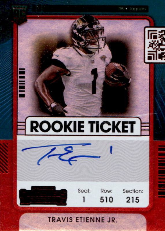 The Travis Etienne Jr. 2021 Contenders #112 Rookie Ticket Auto - Red Zone Ticket card in Raw condition has not changed in price in the last 30 days and was last sold for $45.00 .