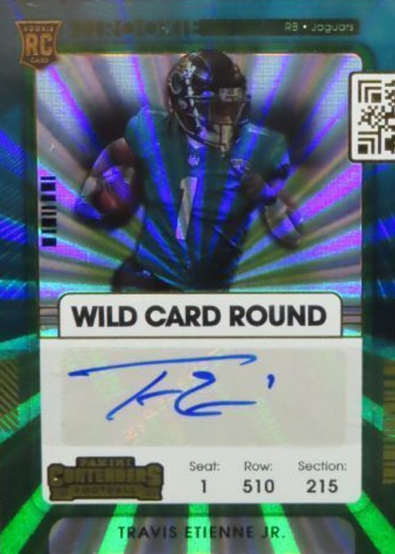The Travis Etienne Jr. 2021 Contenders #112 Rookie Ticket Auto - Wild Card card in Raw condition has not changed in price in the last 30 days and was last sold for $40.00 .