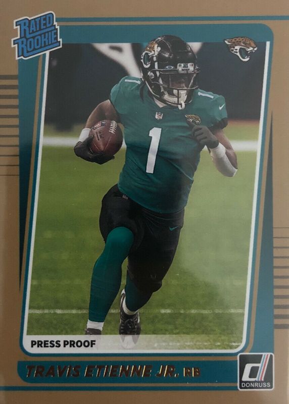 The Travis Etienne Jr. 2021 Donruss #258 Press Proof Bronze Rookie card in Raw condition has not changed in price in the last 30 days and was last sold for $1.49 .
