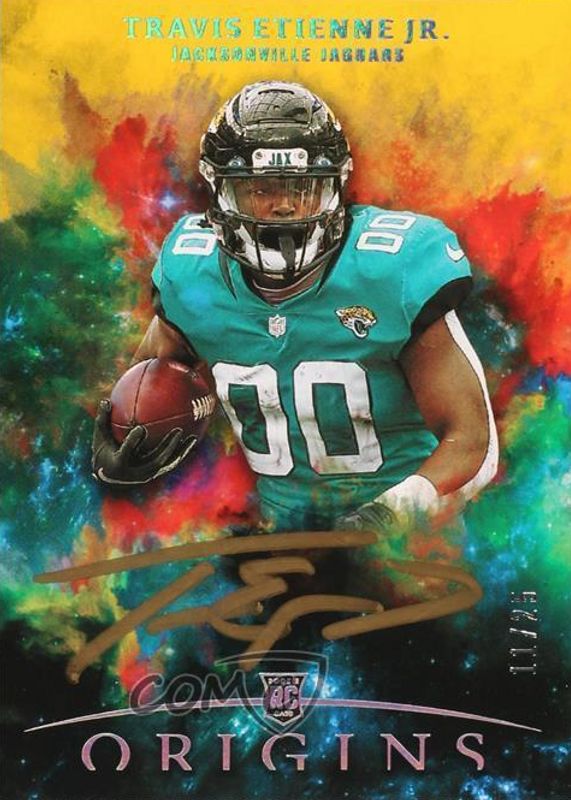 The Travis Etienne Jr. 2021 Origins #OA-TE Origins Autographs - Gold Ink (/25) Rookie card in Raw condition has not changed in price in the last 30 days and was last sold for $25.00 .