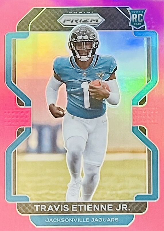 The Travis Etienne Jr. 2021 Prizm #344 Pink Rookie card in Raw condition has moved up $4.64 (+464%) in the last 30 days and was last sold for $5.64 .