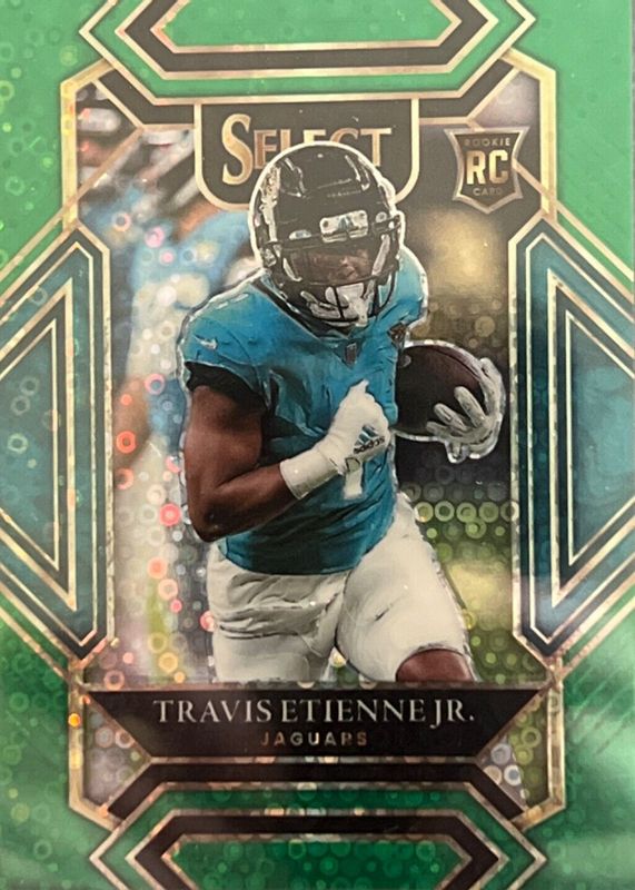 The Travis Etienne Jr. 2021 Select #254 Club Level Green Disco /5 Rookie card in Raw condition has not changed in price in the last 30 days and was last sold for $60.00 .