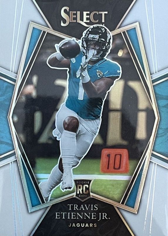The Travis Etienne Jr. 2021 Select #154 Premier Level White /35 Rookie card in Raw condition has moved up $17.50 (+233%) in the last 30 days and was last sold for $25.00 .