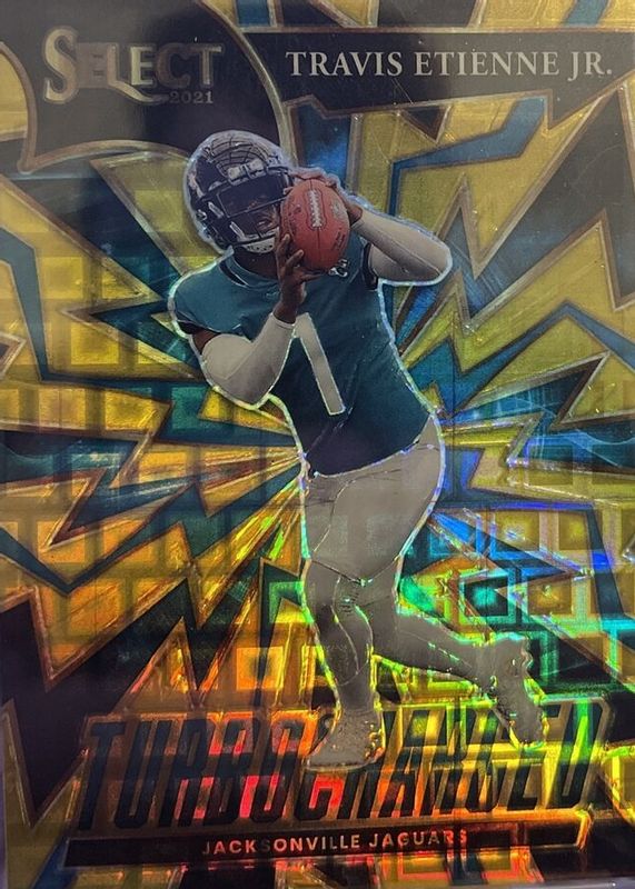 The Travis Etienne Jr. 2021 Select #TUR-7 Turbocharged - Gold /10 Rookie card in Raw condition has not changed in price in the last 30 days and was last sold for $64.99 .