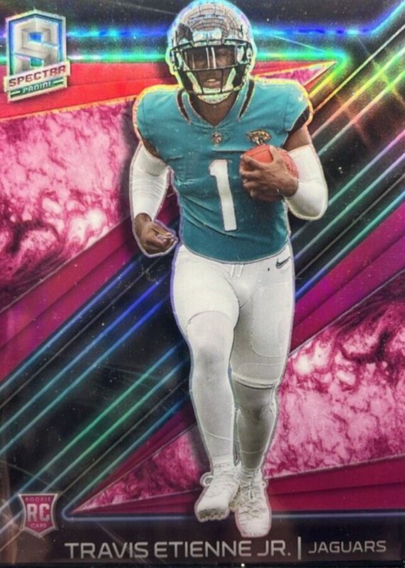 This card is 1 of 3 Travis Etienne Jr.'s card variations in the 2021 Spectra set being tracked by Sports Card Investor, including Base /149, and Retro Spectacle /(SSP).