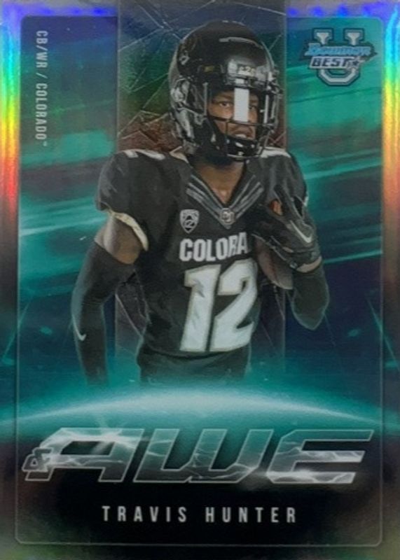 This card is 1 of 2 Travis Hunter's card variations in the 2023 Bowman Best University set being tracked by Sports Card Investor, including Shock & Awe - Superfractor /1.