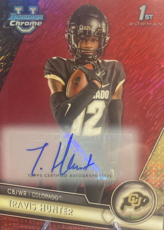 Auctions Ending Soon for Travis Hunter 2023 Bowman Chrome University #36 Prospect Auto - Red Shimmer Refractor /5 (1st) RAW
