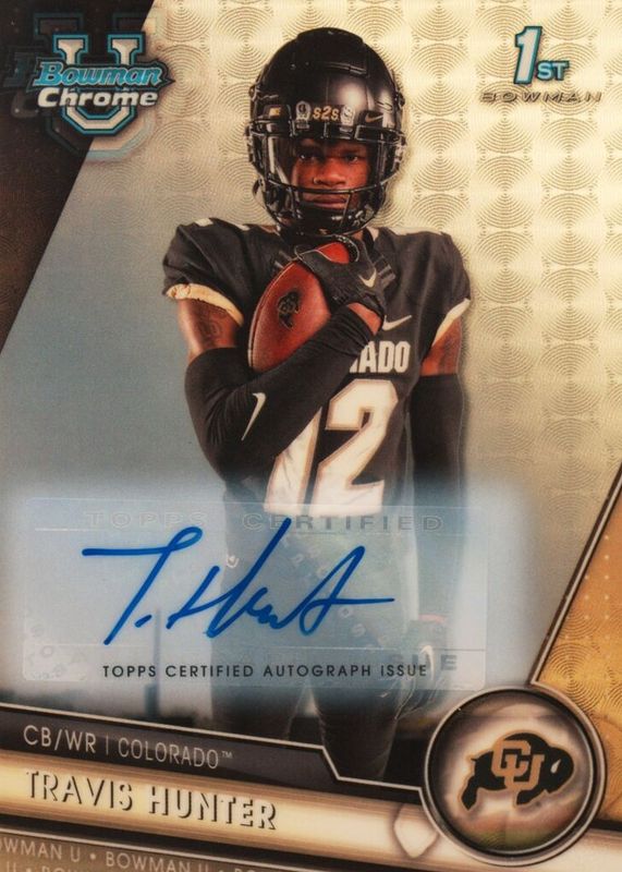This card is 1 of 45 Travis Hunter's card variations in the 2023 Bowman Chrome University set being tracked by Sports Card Investor, including Prospects (1st), Prospects - Pink Refractor (1st), Prospects - Purple Shimmer Refractor (1st), Prospects - Refractor (1st), and Prospects - Surge Refractor (1st).