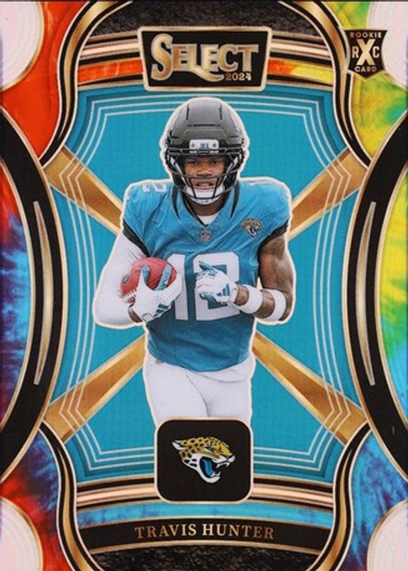 This card is 1 of 12 Travis Hunter's card variations in the 2024 Select set being tracked by Sports Card Investor, including XRC Prizm (WR), XRC Prizm (CB), XRC Prizm Autographs /99, XRC Prizm Autographs - Tie-Dye /25, and XRC Prizm - Tie-Dye /25 (CB).