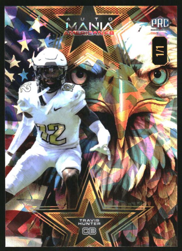 The Travis Hunter 2024 Wild Card Automania American Clearview and Painted Eagle #AMS-TH Star Crystal Holographic Painted Eagle 8 /1 card is 1 of 606 Travis Hunter's card variations in the 2024 Wild Card Automania American Clearview and Painted Eagle set being tracked by Sports Card Investor, including Circle Rainbow American Flag /25, Circle Sparkles American Flag /25, Diamond Mojo American Flag /25, Diamond Rainbow American Flag /25, and Hex Lazers American Flag /25.