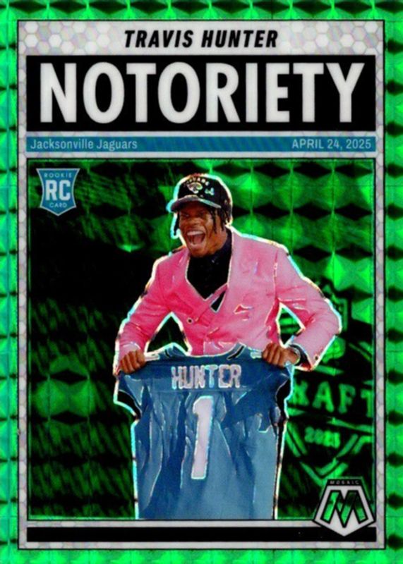 The Travis Hunter 2025 Mosaic #12 Notoriety - Green Rookie card in Raw condition has moved down -$0.37 (-17.5%) in the last 30 days and was last sold for $1.75 .