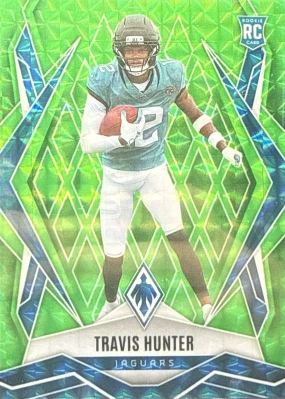The Travis Hunter 2025 Phoenix #157 Lime Green Pyramids /285 Rookie card in Raw condition has moved down -$8.06 (-67.8%) in the last 30 days and was last sold for $3.83 .