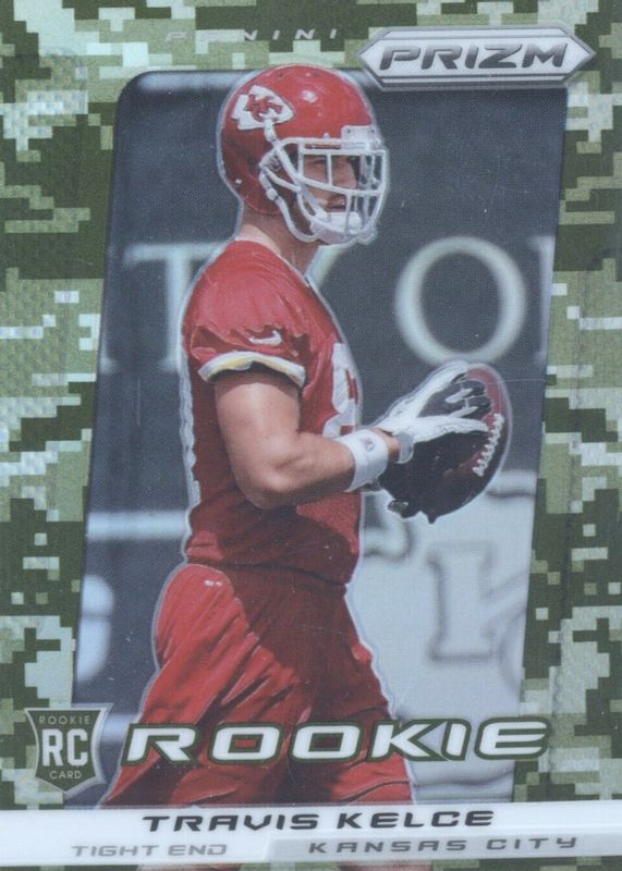 The Travis Kelce 2013 Prizm #292 Camo Rookie card in Raw condition has not changed in price in the last 30 days and was last sold for $299.95 .