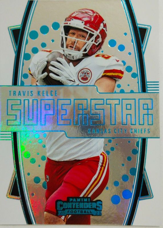 The Travis Kelce 2023 Contenders #6 Superstar /(SSP) card in Raw condition has not changed in price in the last 30 days and was last sold for $12.99 .