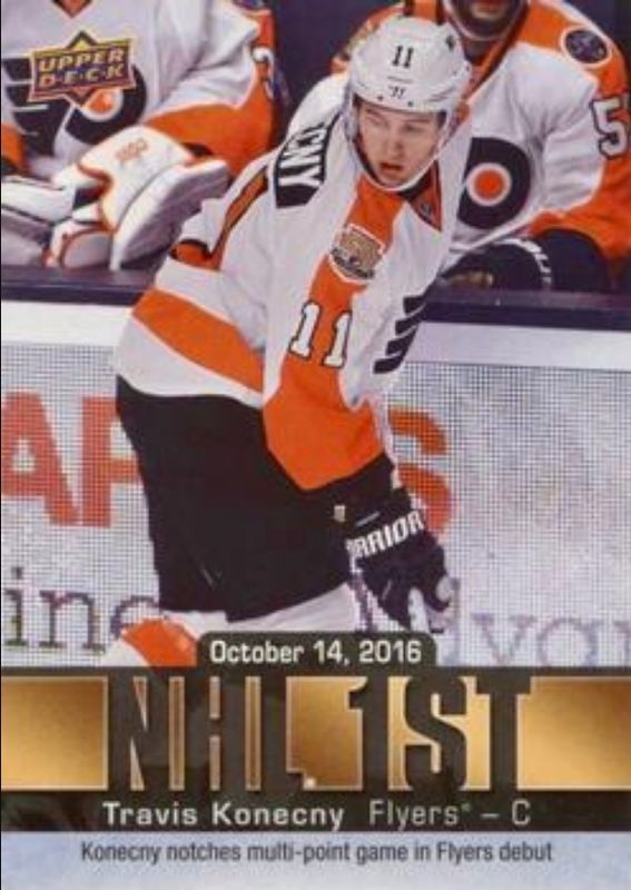The Travis Konecny 2016 Upper Deck #NF-9 NHL Firsts Rookie card is 1 of 33 Travis Konecny's card variations in the 2016 Upper Deck set being tracked by Sports Card Investor, including Young Guns Base, Young Guns Canvas, Young Guns - Clear Cut, Young Guns - Gold Rainbow Foil, and Young Guns - Jumbo.