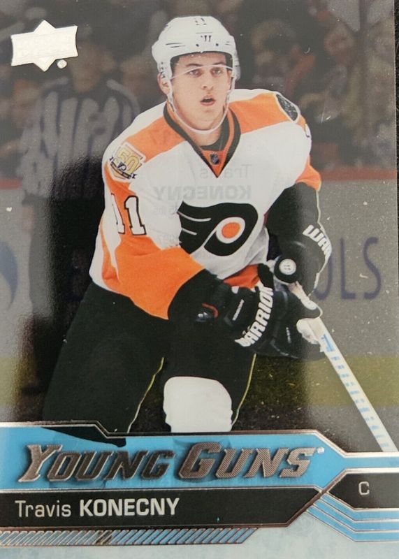 This card is 1 of 9 Travis Konecny's card variations in the 2016 Upper Deck set being tracked by Sports Card Investor, including Young Guns Base, Young Guns Canvas, Young Guns - Gold Rainbow Foil, Young Guns - Jumbo, and Young Guns - Silver Foil.