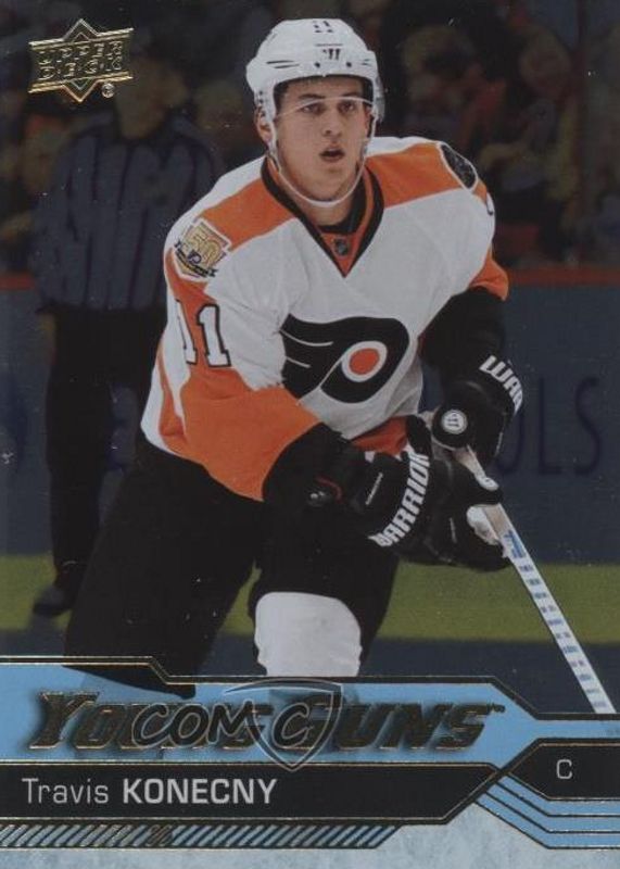 This card is 1 of 9 Travis Konecny's card variations in the 2016 Upper Deck set being tracked by Sports Card Investor, including Young Guns Base, Young Guns Canvas, Young Guns - Clear Cut, Young Guns - Gold Rainbow Foil, and Young Guns - Jumbo.