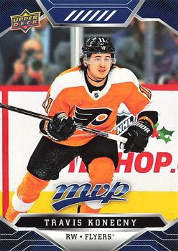 The Travis Konecny 2019 Upper Deck MVP #151 Blue card is 1 of 12 Travis Konecny's card variations in the 2019 Upper Deck MVP set being tracked by Sports Card Investor, including Base, Gold Script, Puzzle Backs, Silver Script, and Super Script /25.