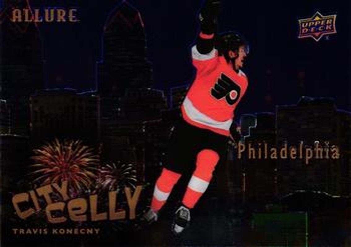 The Travis Konecny 2020 Upper Deck Allure #CC-4 City Celly card is 1 of 38 Travis Konecny's card variations in the 2020 Upper Deck Allure set being tracked by Sports Card Investor, including Base, 2005 Shield, Black Rainbow, Blue China, and Leopard.