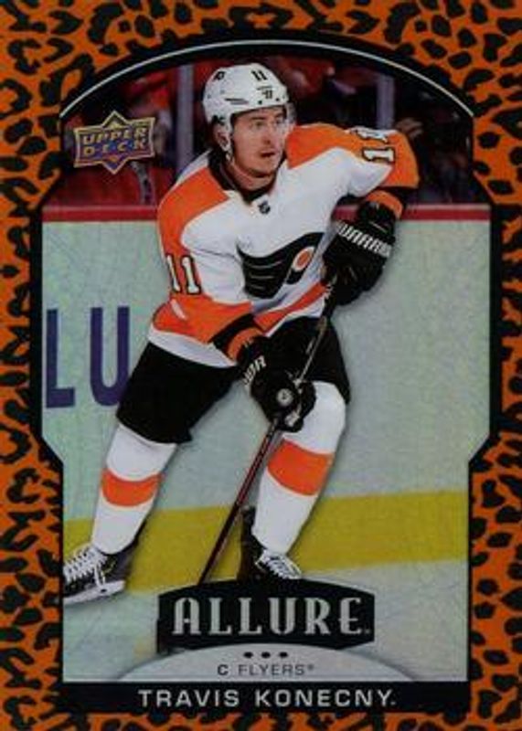 The Travis Konecny 2020 Upper Deck Allure #20 Leopard card is 1 of 38 Travis Konecny's card variations in the 2020 Upper Deck Allure set being tracked by Sports Card Investor, including Base, 2005 Shield, Black Rainbow, Blue China, and Magenta.